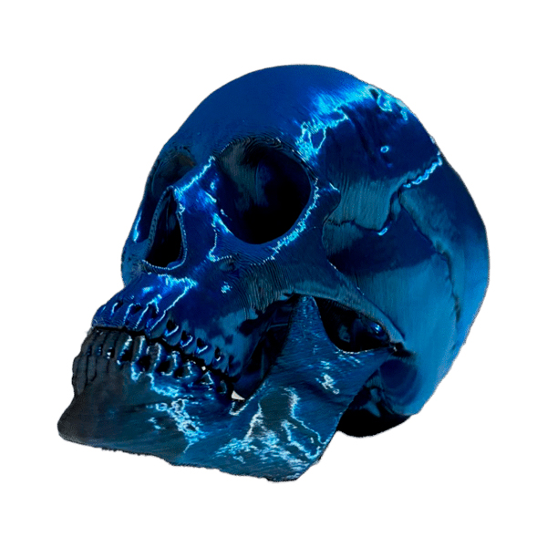 Cráneo impreso en filamento bitono (azul-negro), 9cm de altura.
