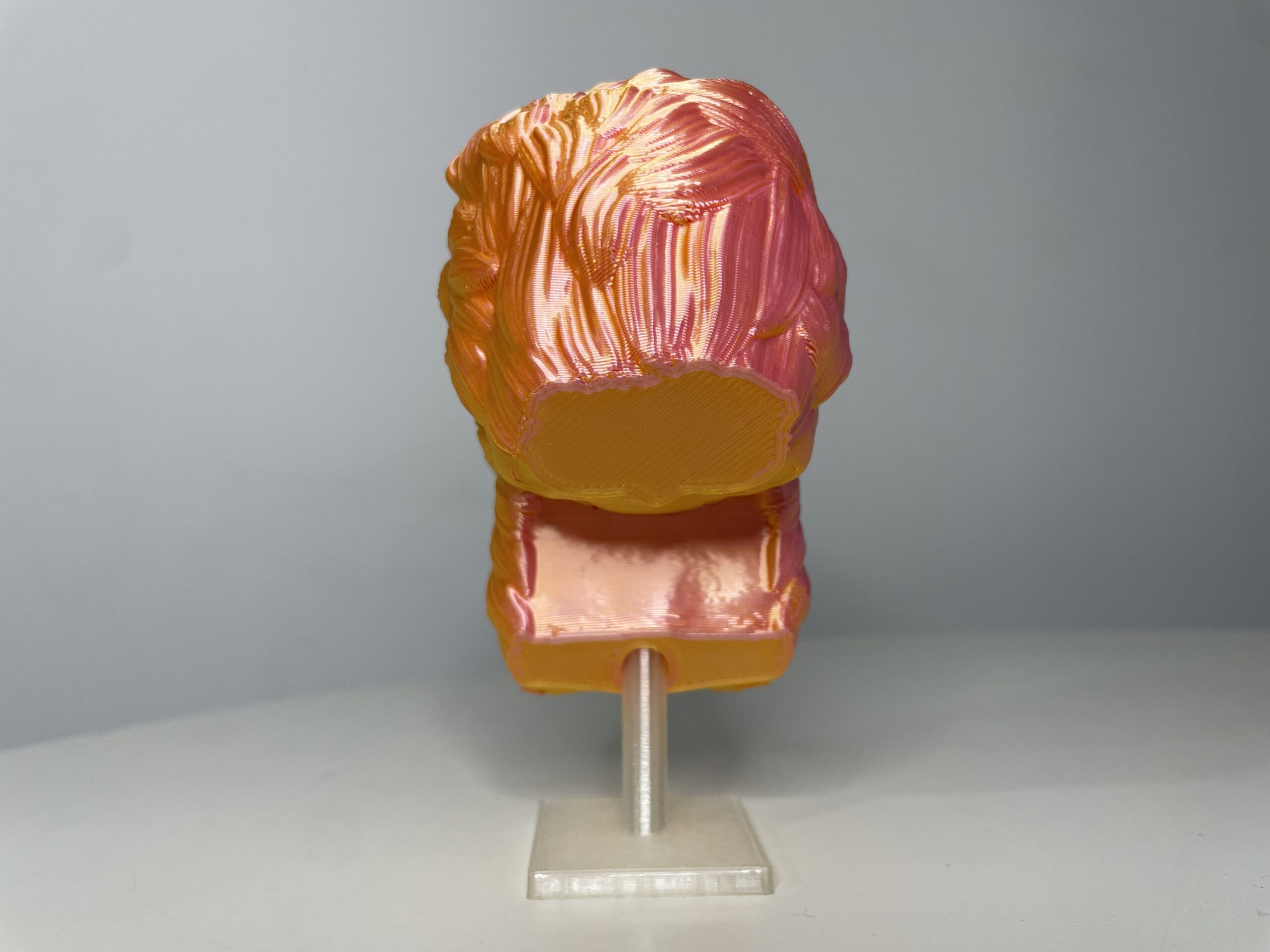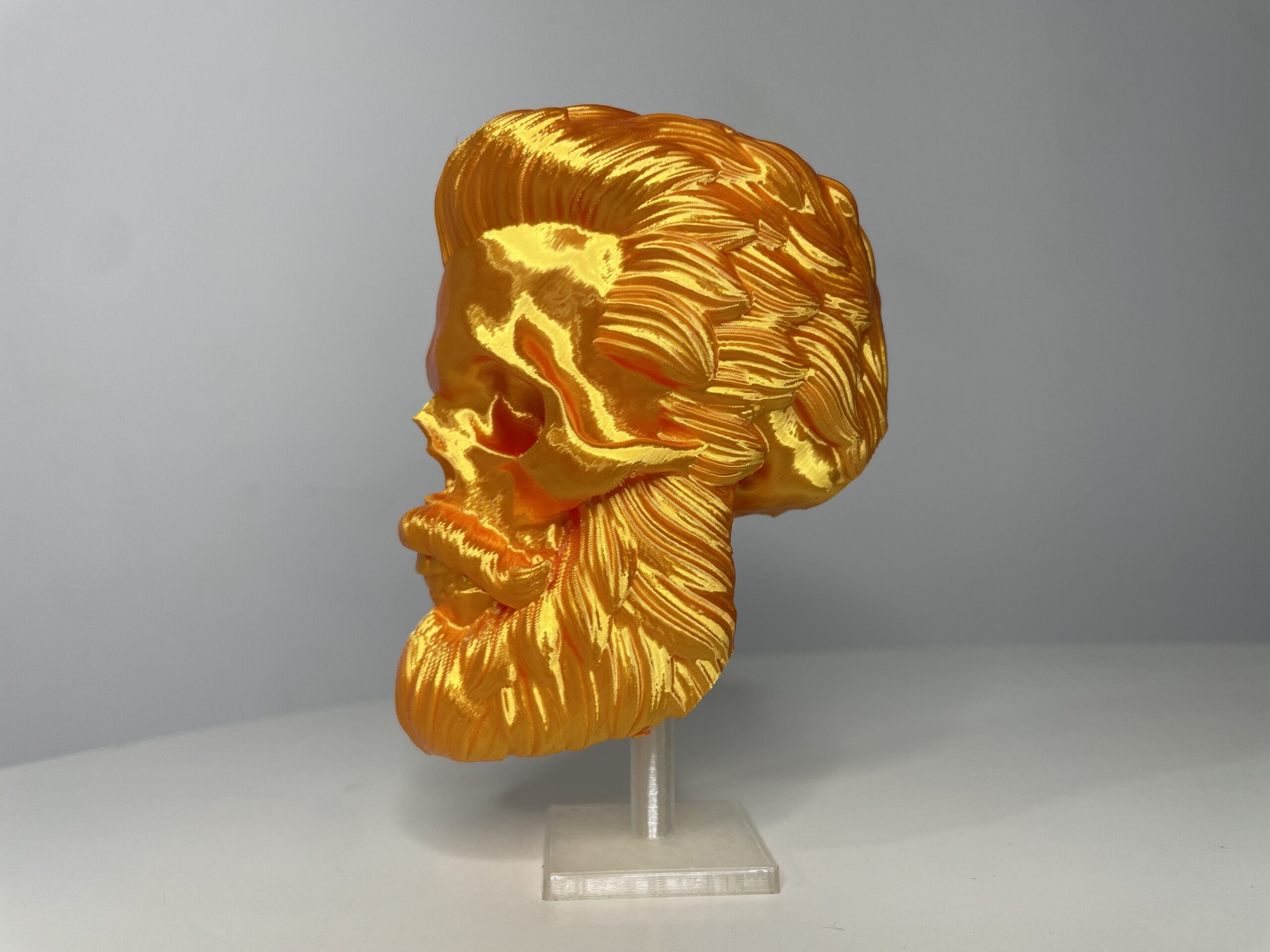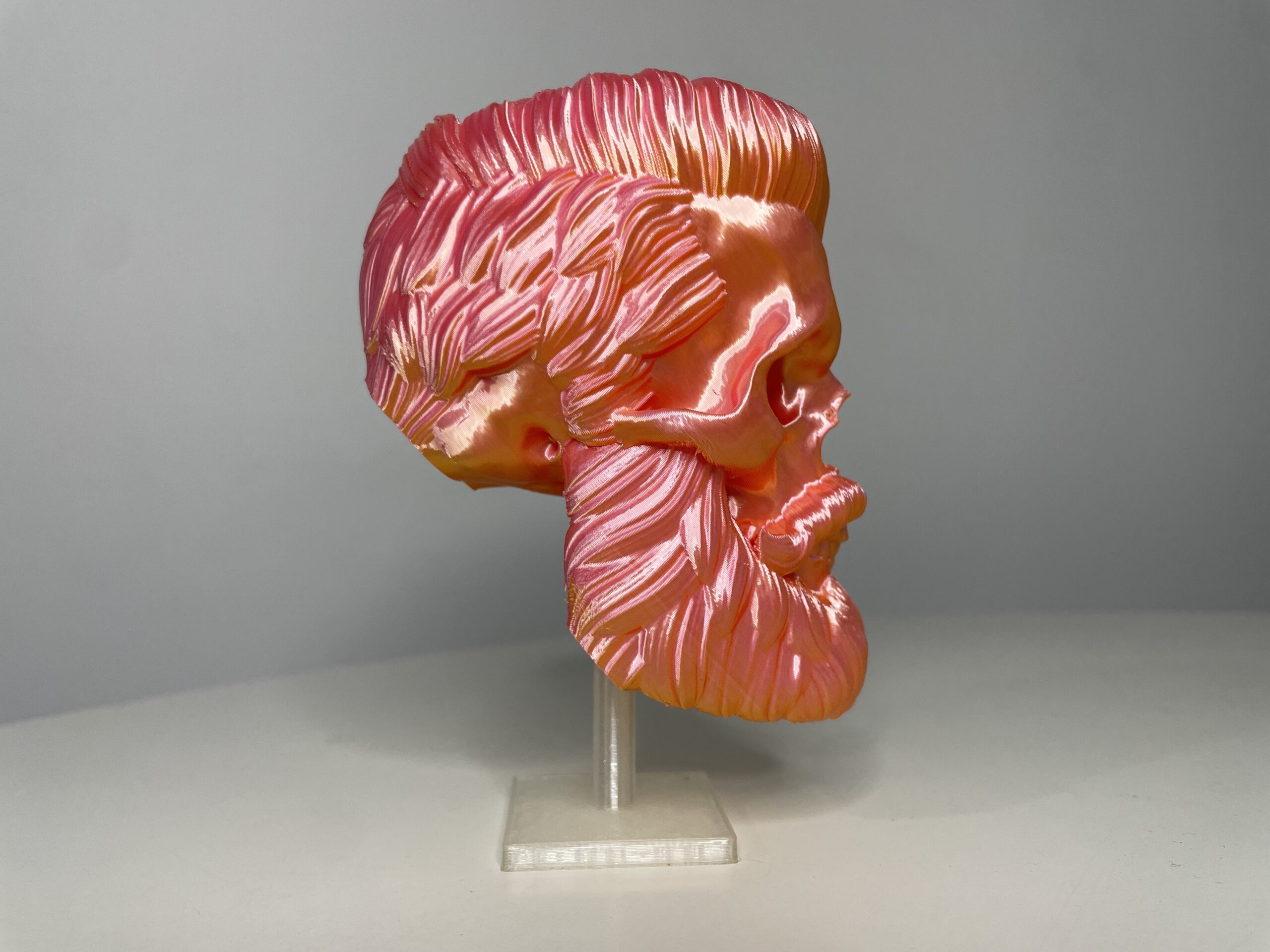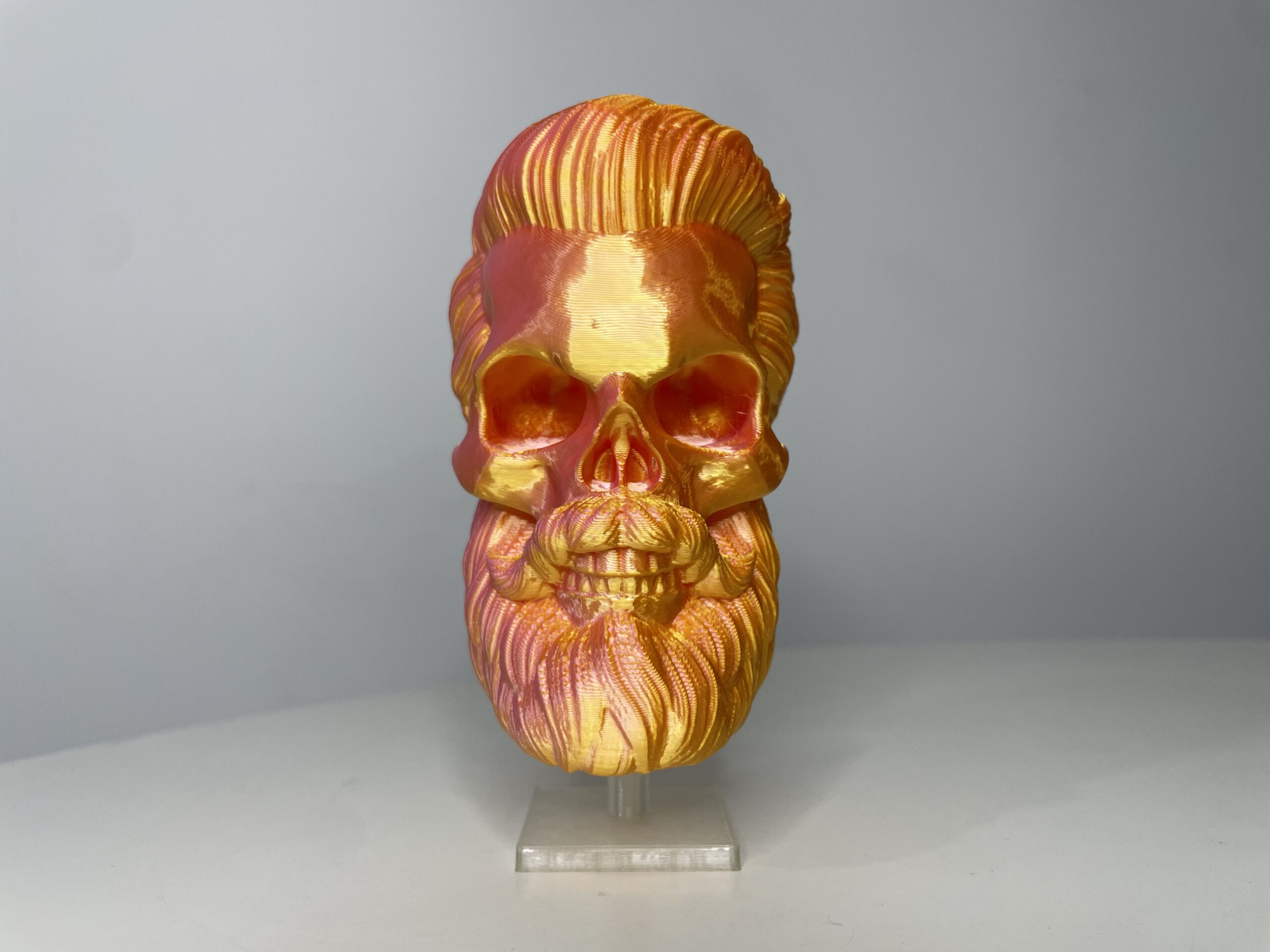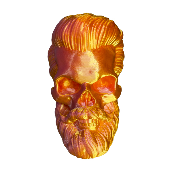 Calavera que ha sido estilizada y reinterpretada de forma moderna y con elementos de la estética hipster. Impresa en filamento bitono (dorado-rosado)